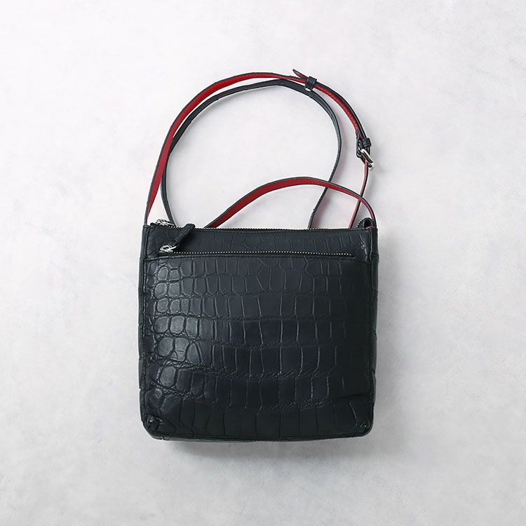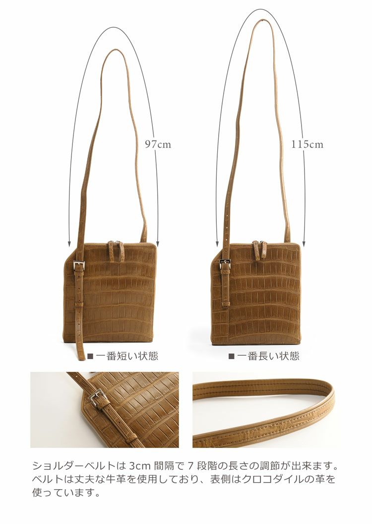 両手が空いて便利なショルダーバッグは、マット加工のクロコダイルで作ることでカジュアルなのに上品なイメージに。
