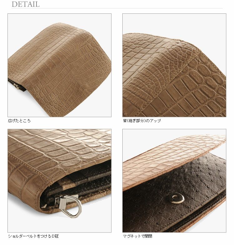 素材表側:クロコダイル(本革) /内装:オーストリッチ、クロコダイル(一部)、生地、牛革