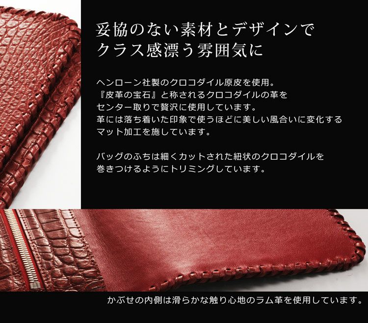 | 素材 | 表側:クロコダイル 内装:ラム革、スエード調の生地 |