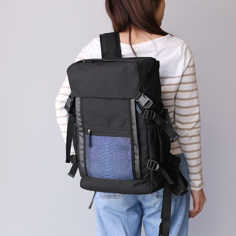 ナイロンをベースにダイヤモンドパイソンのアクセントがおしゃれな四角いリュックサック。