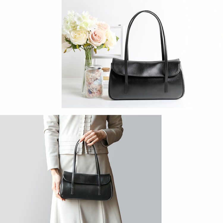 ブラックカラーの上品な光沢感が美しい牛革フォーマルバッグ。