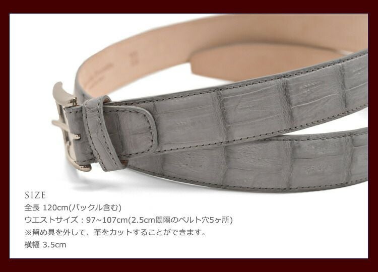 全長 120cm(バックル含む) ウエストサイズ:97~107m(2.5cm間隔のベルト穴5ヶ所) ※金具部分が外れるので、革をカットすることができます。 横幅 3.5cm |