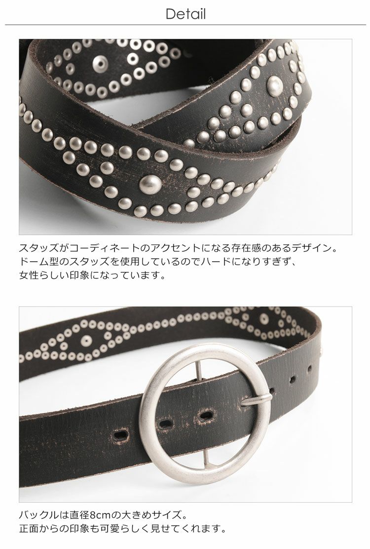 円形の大きなバックルとスタッズデザインが特徴的な牛革ベルト。