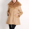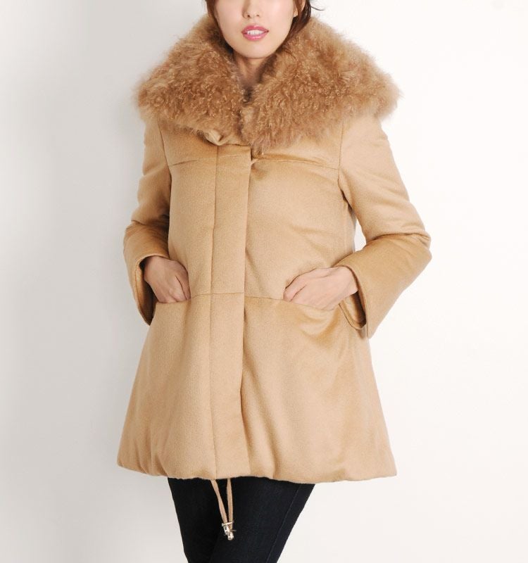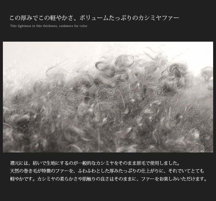 襟元には、天然の巻き毛が特徴のカシミヤファーを使い、