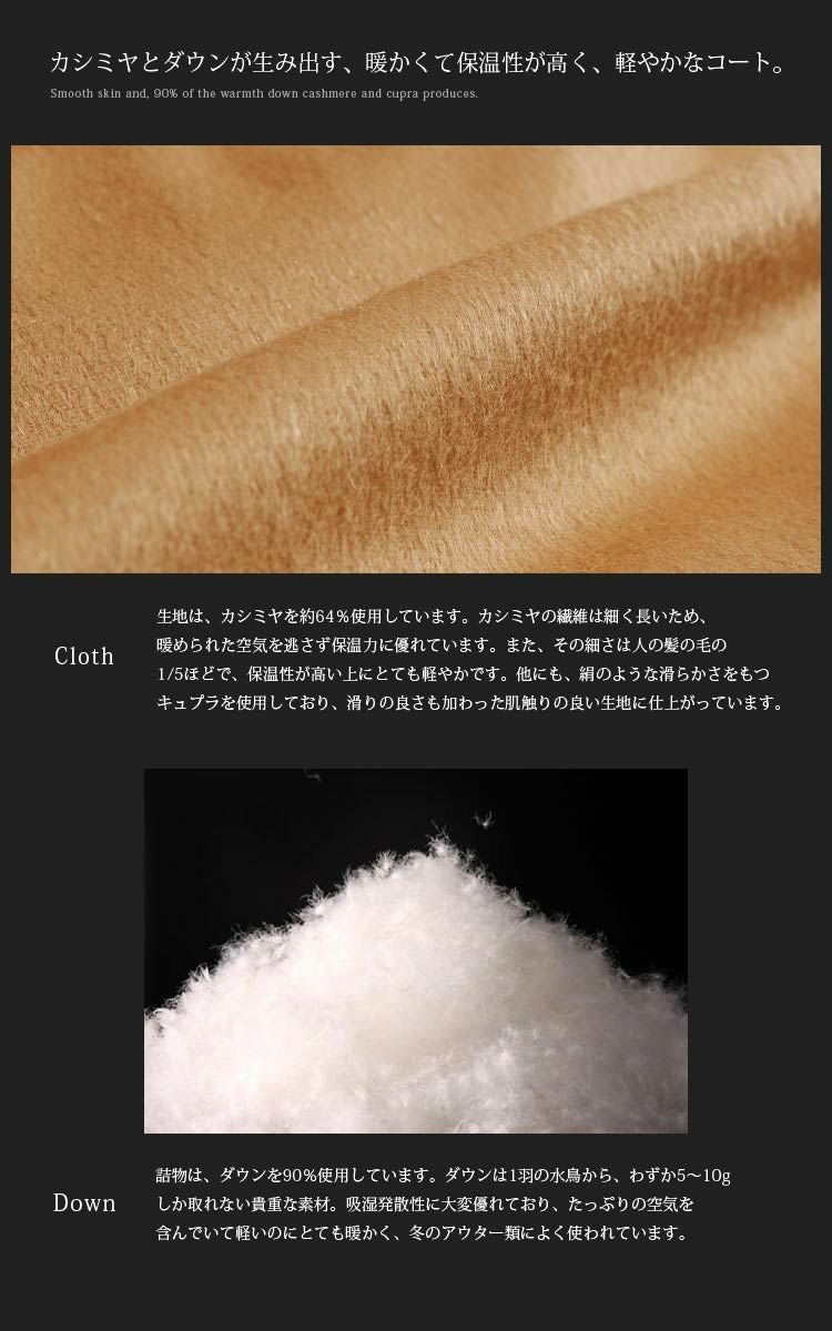 | 素材 | 表地:カシミヤ64.4%、アクリル21.3%、キュプラ14.3% 毛皮:カシミヤファー 裏地:ポリエステル100% 詰物:ダウン90%、フェザー10% |