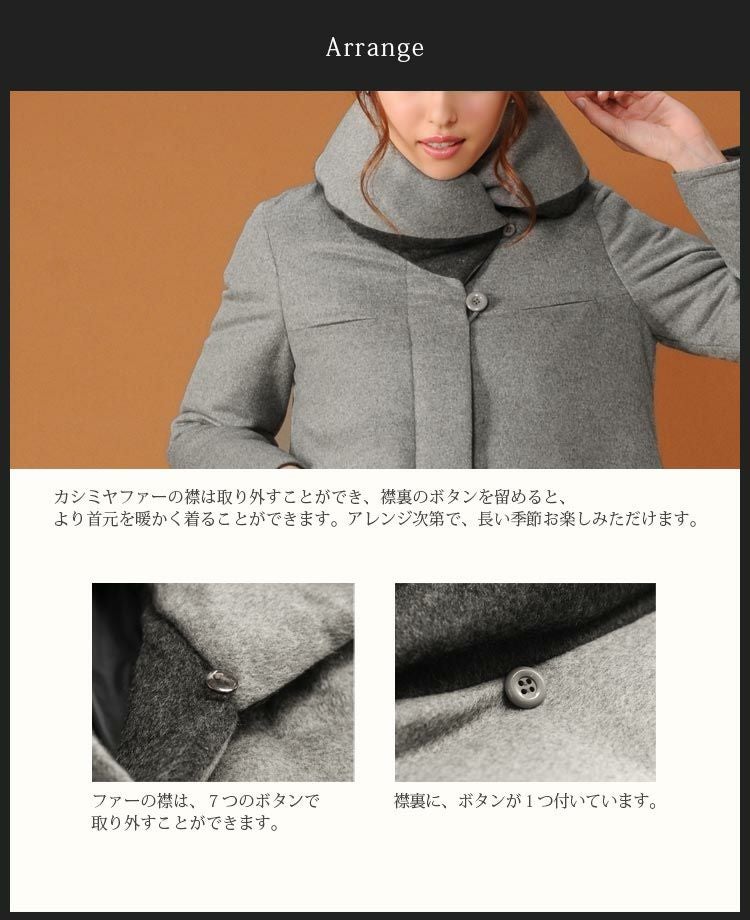 | 備考 | ・裾に絞りが付いています。 ・カシミヤファーは、7個のボタンで取り外すことができます。 |