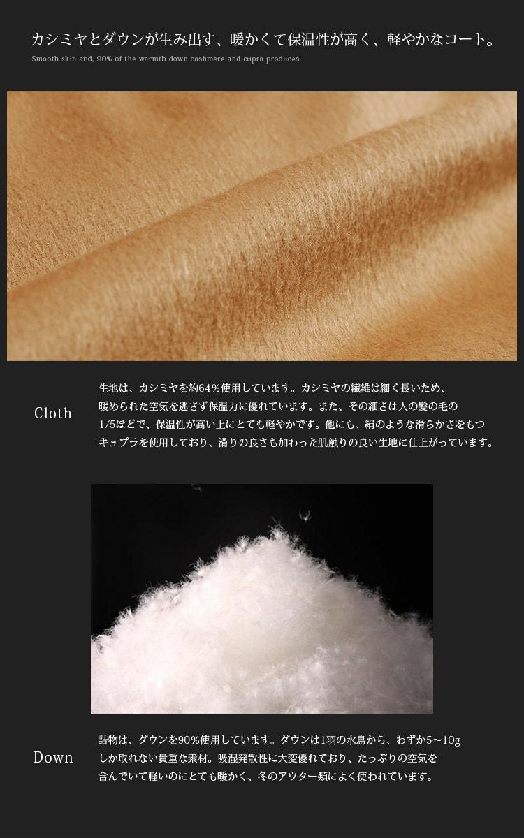 カシミヤをふんだんに使用したダウンコートです。