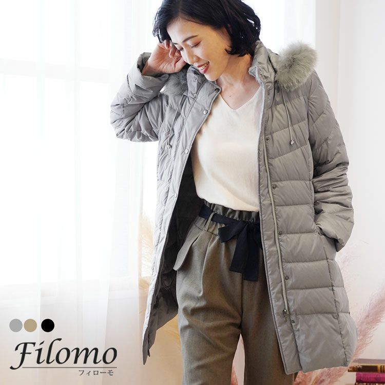 ※キーワード:ダウン コート アウター 上着 レディース 女性 ブランド Filomo フィローモ 軽量 軽い ライトダウン ダウン80% フード付き 取り外し可能 フォックス ファー リアルファー 毛皮 暖かい ゆったり おしゃれ かわいい 高級感 防寒 保温性 冬 大きめサイズ ミセス 30代 40代 50代 M L LL ハーフコート ミディアム グレー ベージュ ネイビー ブラック Aライン シルエット シンプル スリム 着ぶくれしない