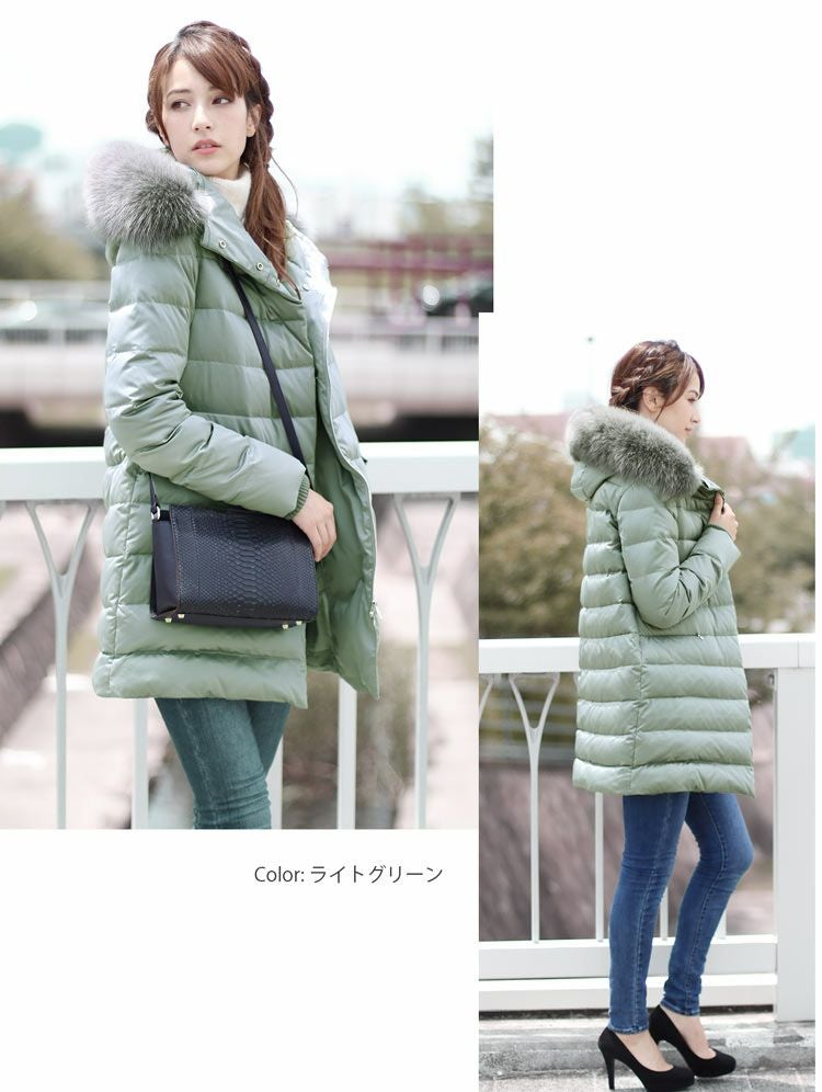 ダウンコート レディース 暖かい ファー トリミング ダウン 90% 大きいサイズ フード付き フォックス ライトグリーン/ダークグレー/ブラック M/L/LL 冬 アウター ギフト
