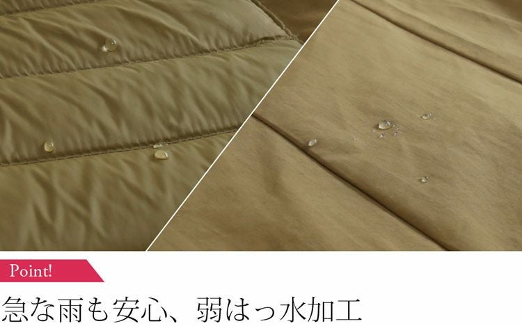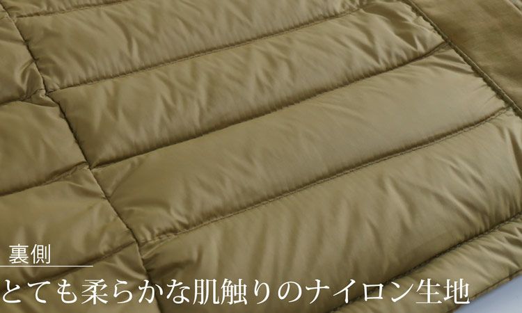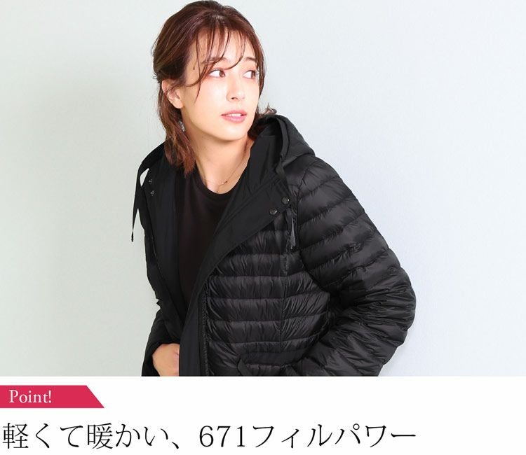 | 素材 | 表側:綿65%、ナイロン35% 裏側:ナイロン100% 詰物(本体):ダウン80%、フェザー20% 詰物(フード部分):ポリエステル100% |
