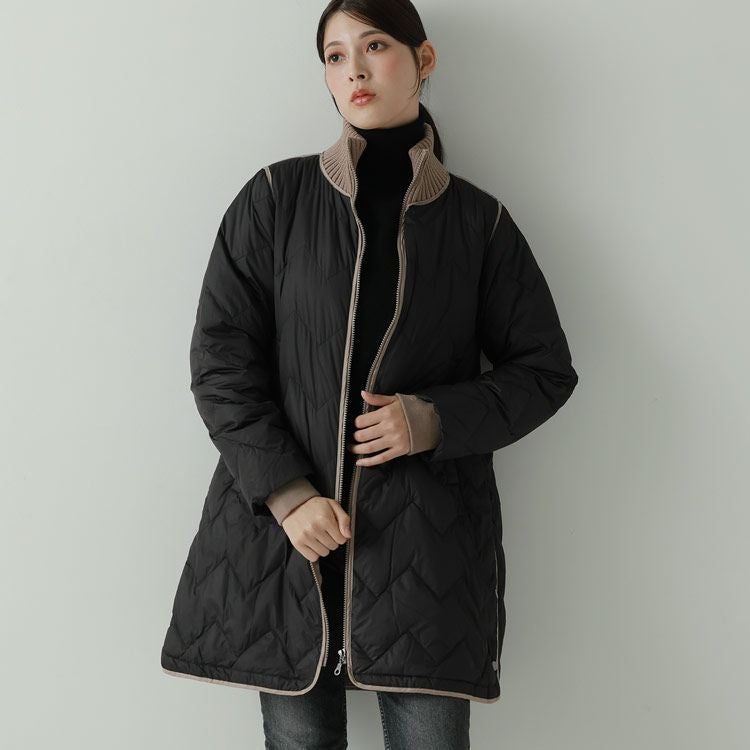 ※キーワード:≪Filomo / フィローモ≫ ブラック グレージュ アイボリー バイカラー ミディアム 膝丈 軽い 上着 暖か シンプル オーバーサイズ 体系カバー Aライン 普段使い メンズライク アウター ダウン コート ジャケット リブ 20代 30代 40代 キルティング 動きやすい 自転車 異素材 切り替え コンビ ドッキング ミックス 白 黒 2023 新作