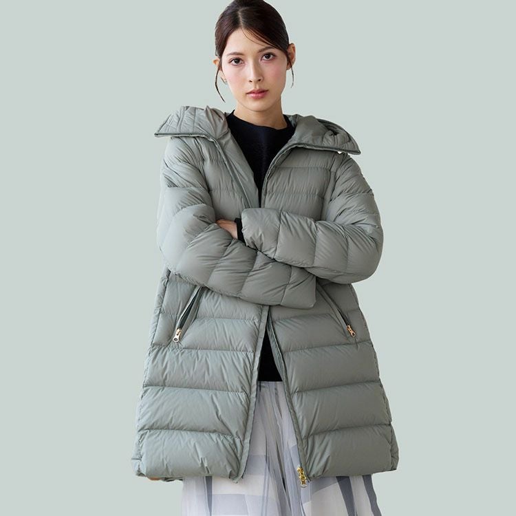軽く、暖かく、におわない高品質なハンガリーグースを使用したミドル丈ダウンコートです。