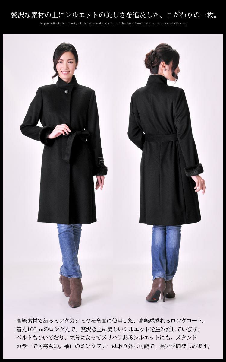 ミンク カシミヤ スタンドカラー ロング コート ミンクファー袖付き 着丈100cm レディース 秋冬 グレージュ/ブラック 9号/11号/13号 母 女性 プレゼント ギフト