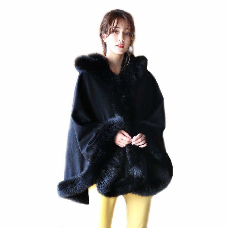 商品名:PIACENZA カシミヤ 100% レディース ケープ フォックスファー トリミング フード付き 日本製 撥水加工