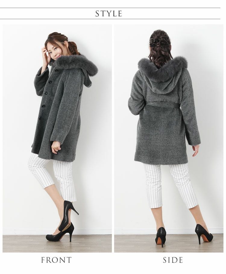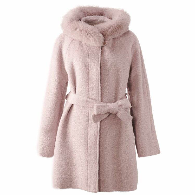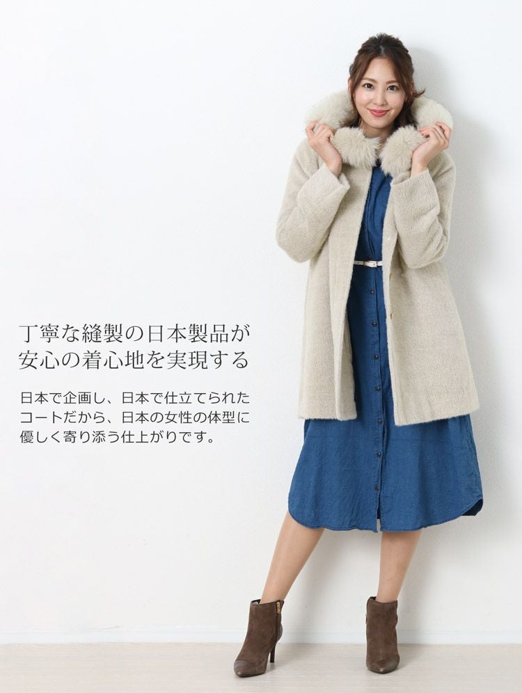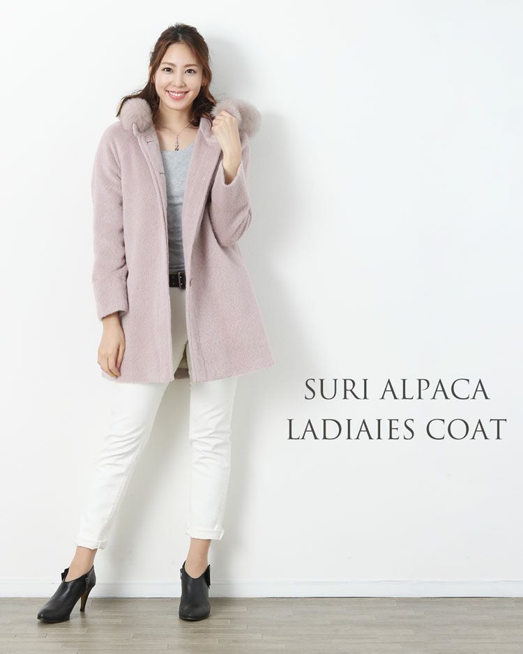 日本製 スーリーアルパカ フード付き コート フォックスファー衿 レディース 秋 冬 ライトベージュ/レトロピンク/ダークグレー/ブラック 9号/11号/13号 大きいサイズ プレゼント ギフト