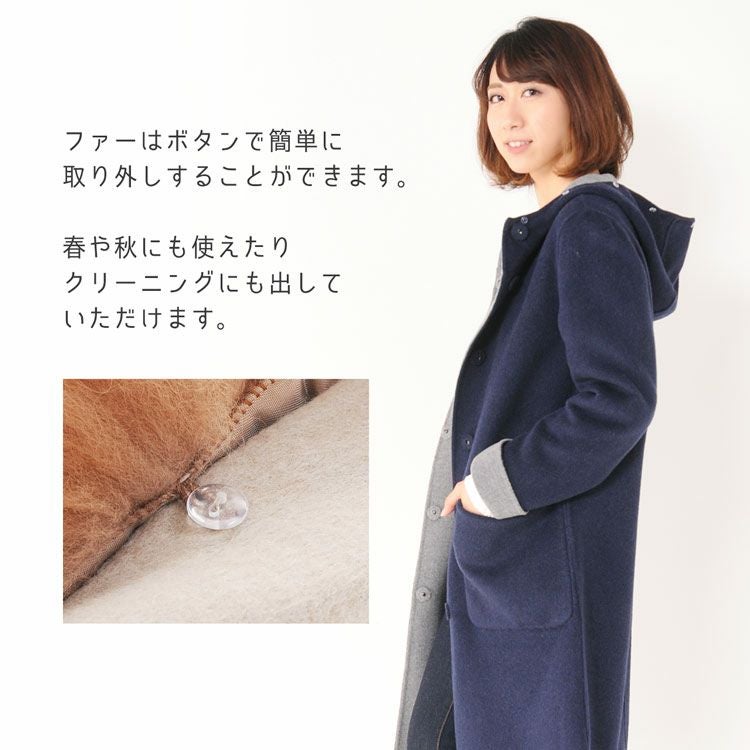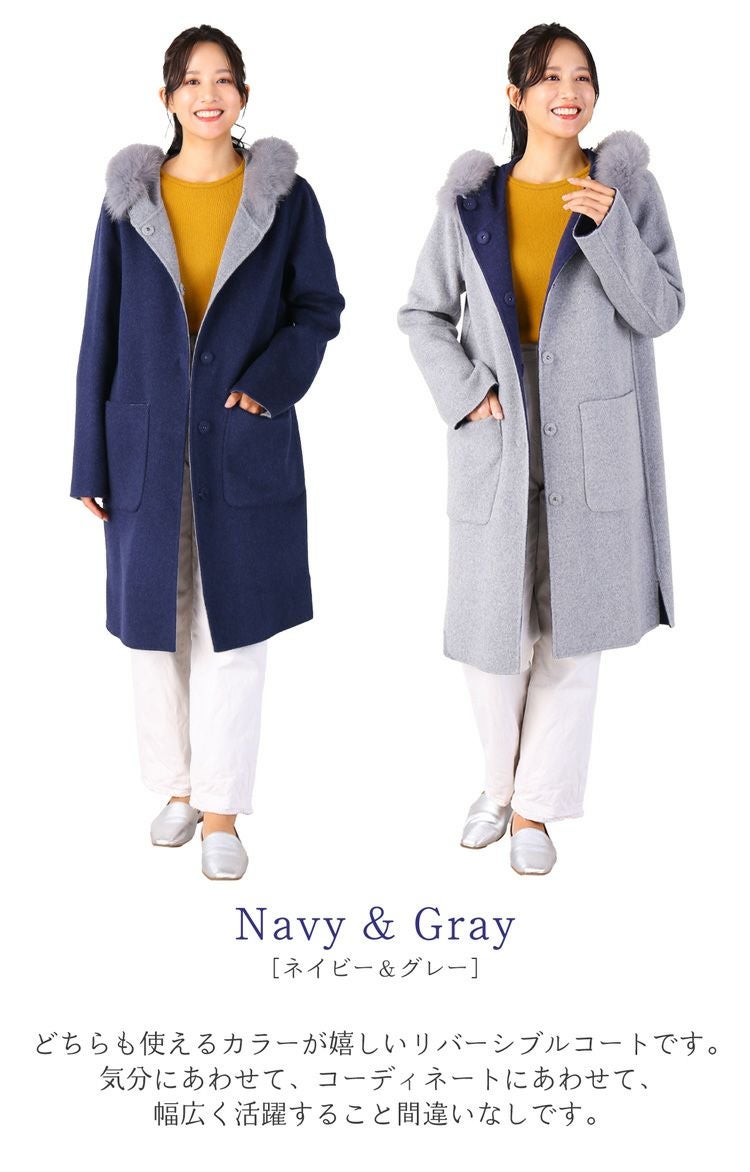 ウール リバーシブル コート フォックス ファー トリミング ダブルフェイス 着丈98cm 秋冬 レディース ベージュ/ネイビー 母親 女性 ギフト