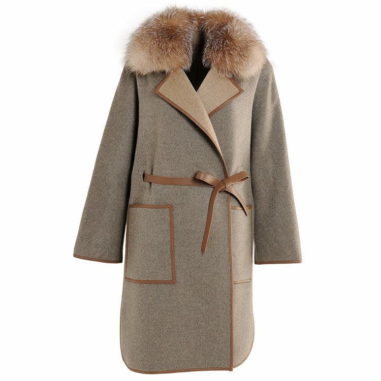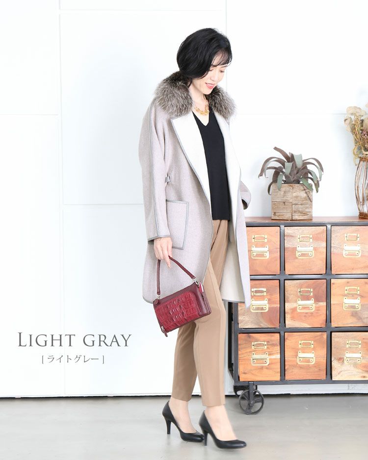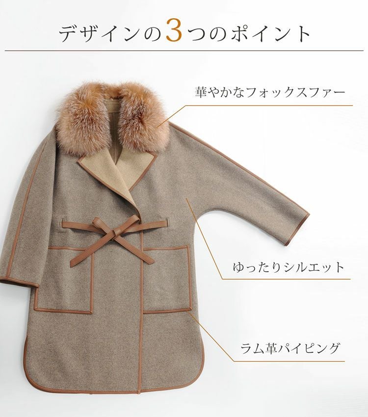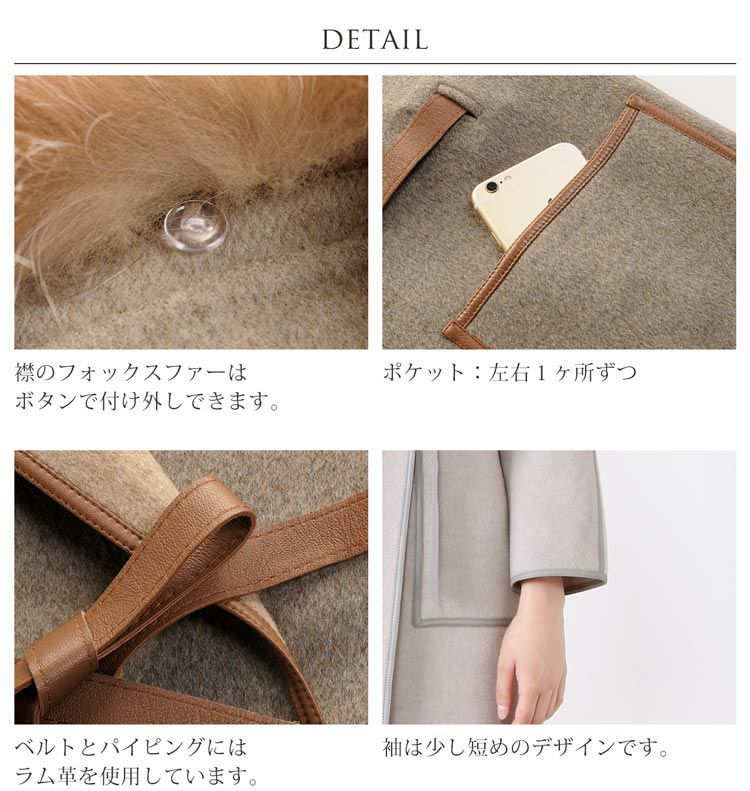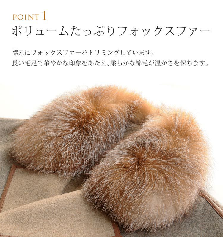 | 素材 | 表地:ウール90%、ポリエステル10% 毛皮:フォックス パイピング・ベルト:羊革 |