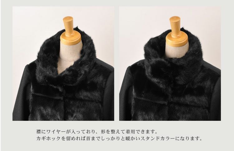 首元はワイヤー入りでスタンドカラーにしたり、ファーカラー風にアレンジしたりできます。