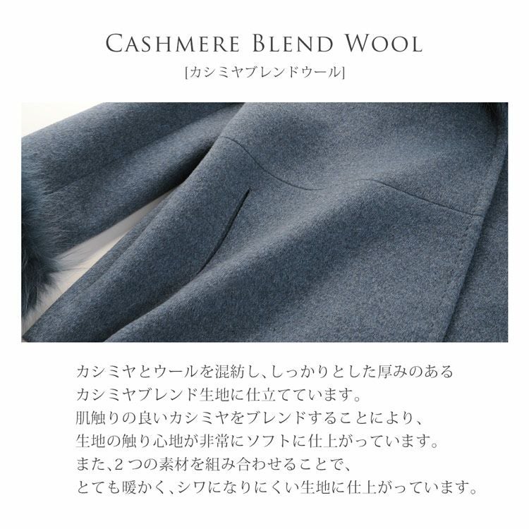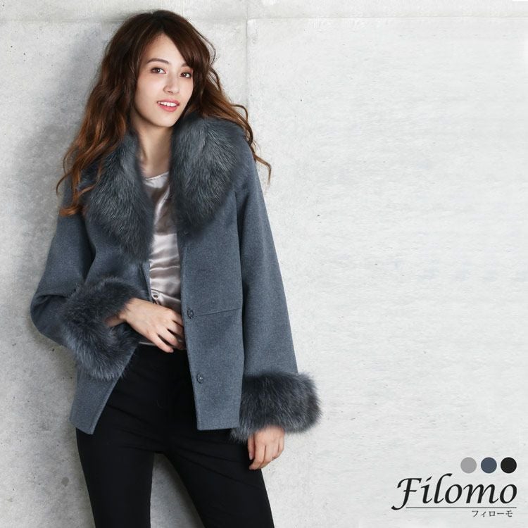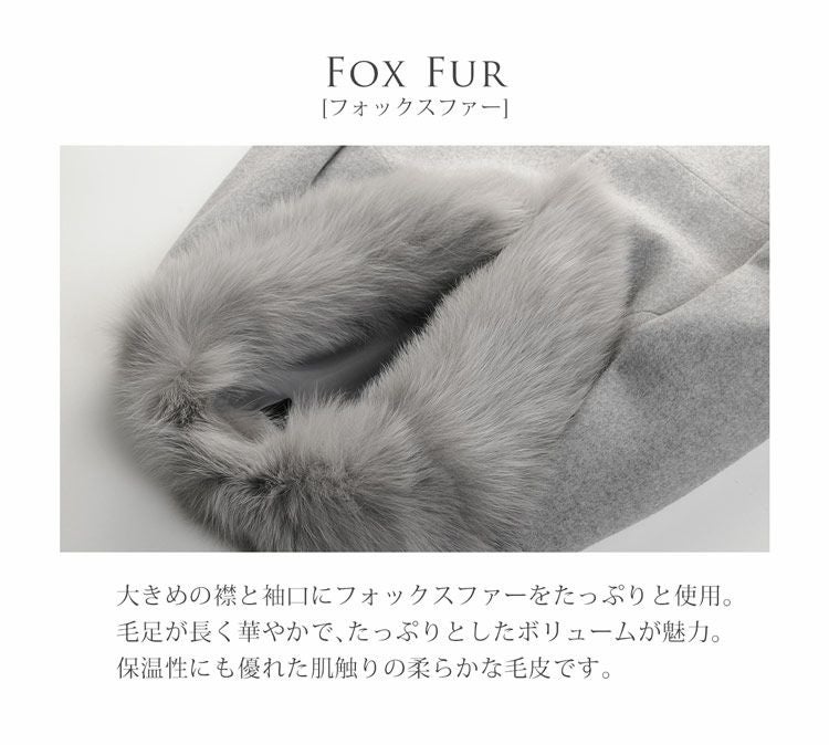 商品名:Filomo カシミヤ ブレンド ウール ジャケット レディース フォックス ファー トリミング 着丈66cm ライトグレー/ブルージーン/ブラック M/L