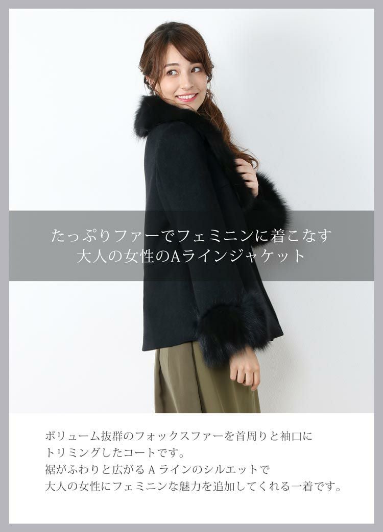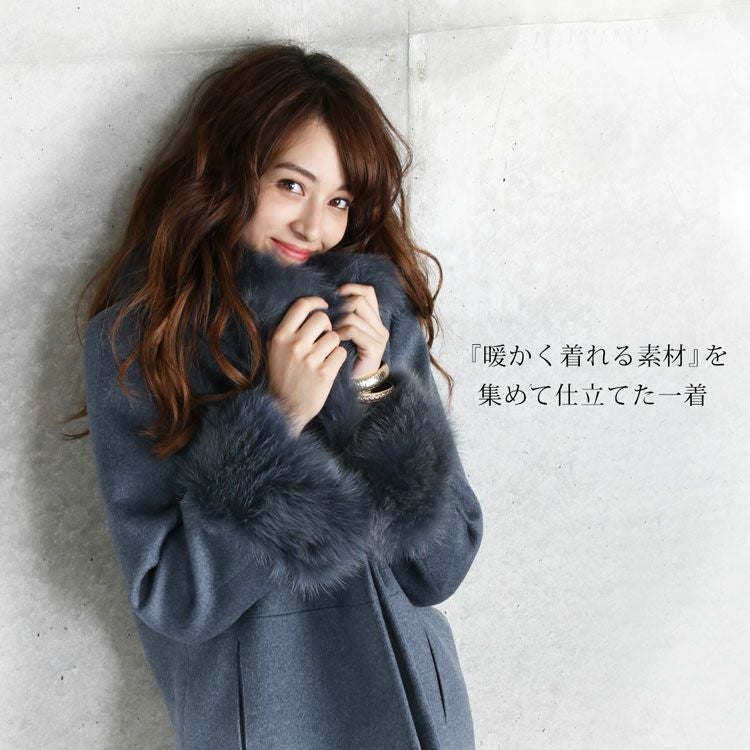 大きな襟と袖口にボリューム抜群のフォックスファーをトリミング。