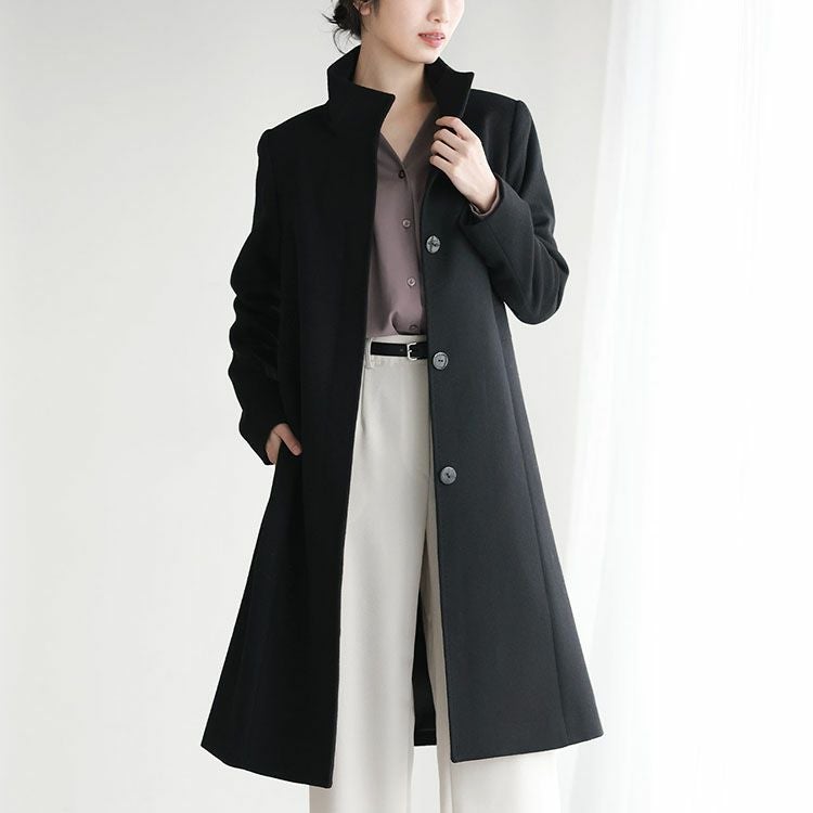 首元からすっきりとしたシルエットになり、 落ち着いた印象でかっこよく着られる スタンドカラーコート。 襟を立てて着られるので、首元までしっかりと暖かい一着。 着丈100cmの長め丈でエレガントな縦長シルエット。 結婚式や卒業式、冠婚葬祭にも使える上品なコートです。 →着丈-5cmのカシミヤ100%スタンドカラーコートはコチラ。