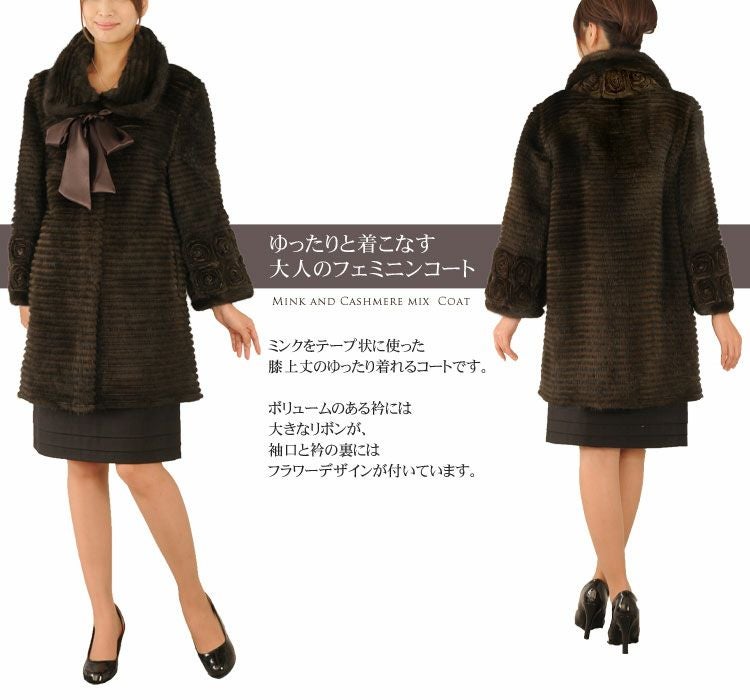 ミンク カシミヤ混 コート リボン フラワー デザイン 7F
