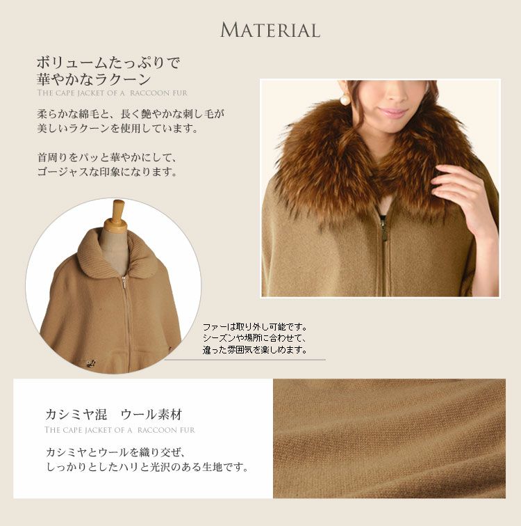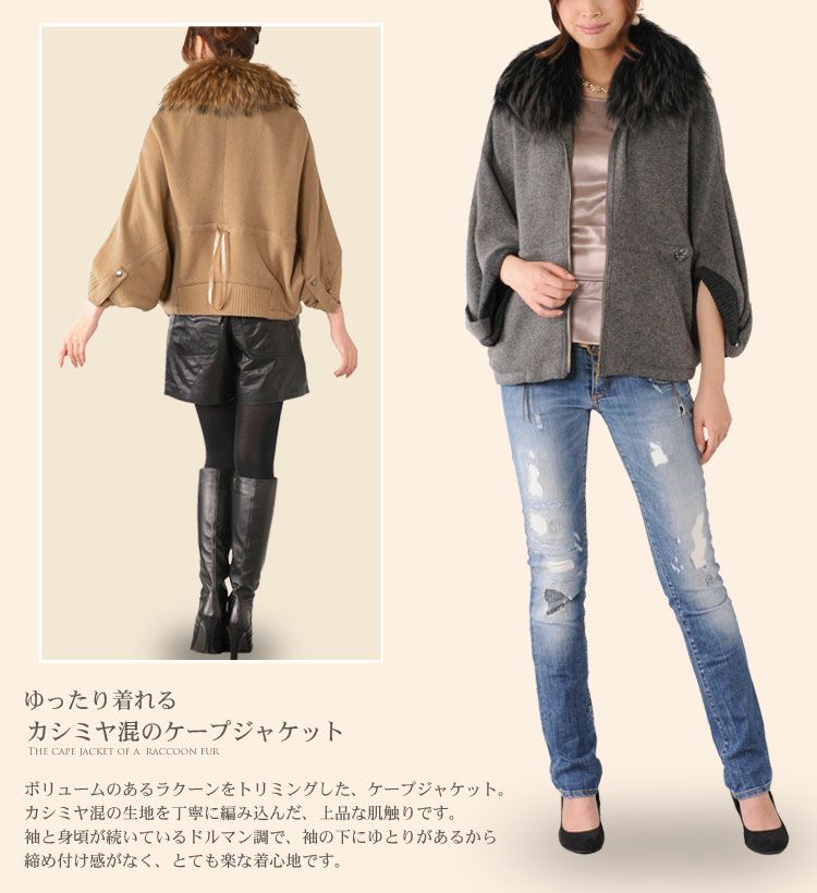 カシミヤ混 ニット ケープ ドルマン ケープジャケット ラクーンファートリミング レディース キャメル/グレー/モカ 秋 冬 女性 マント ギフト