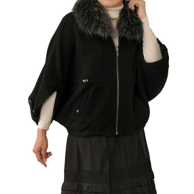 カシミヤ混 ニット ケープ ジャケット ラクーン トリミング ドルマン 7F