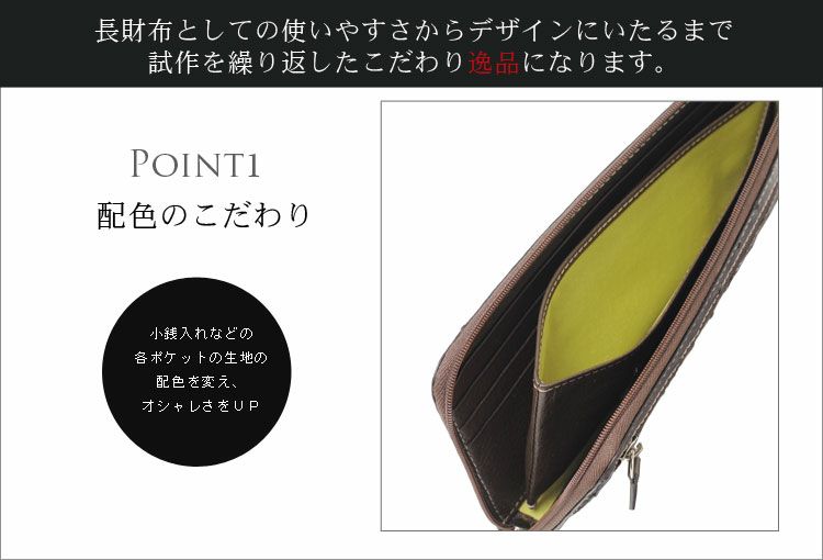 L字ファスナーで大きく開き見た目以上に収納力が豊富で使いやすい長財布です。