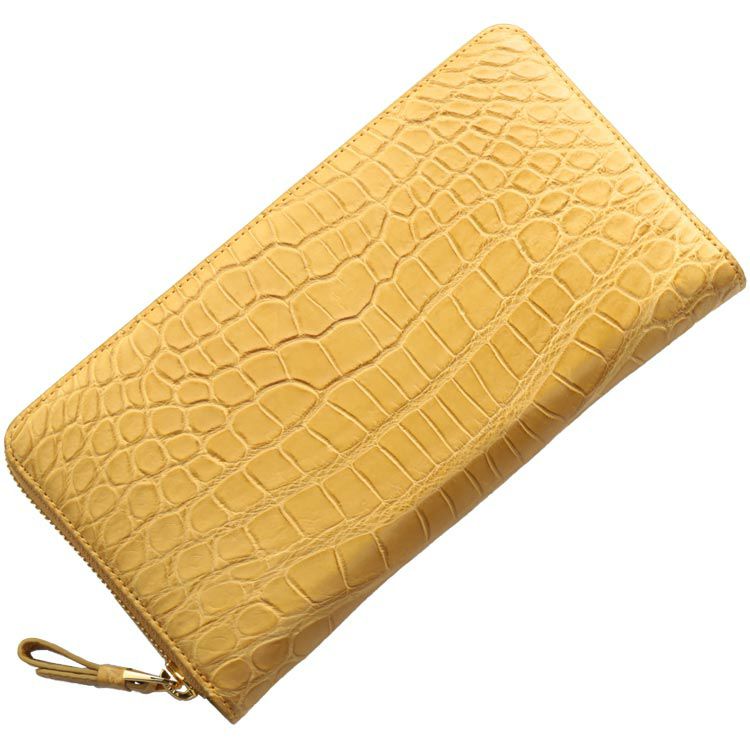 金色に輝く真鍮のラウンドジップや内側もクロコダイルを使用した豪華さが特徴的。