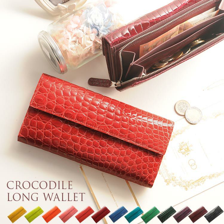 天然皮革 エキゾチックレザー クロコダイル 長財布 レディース 日本製 かぶせ 背面L字ファスナー シャイニング 加工 全13色 JRA 本革 鰐革 母 女性 プレゼント サイフ 花 以外 ギフト 春財布 ギフト