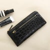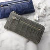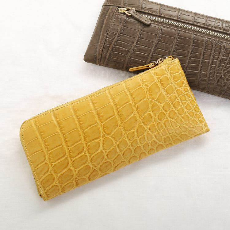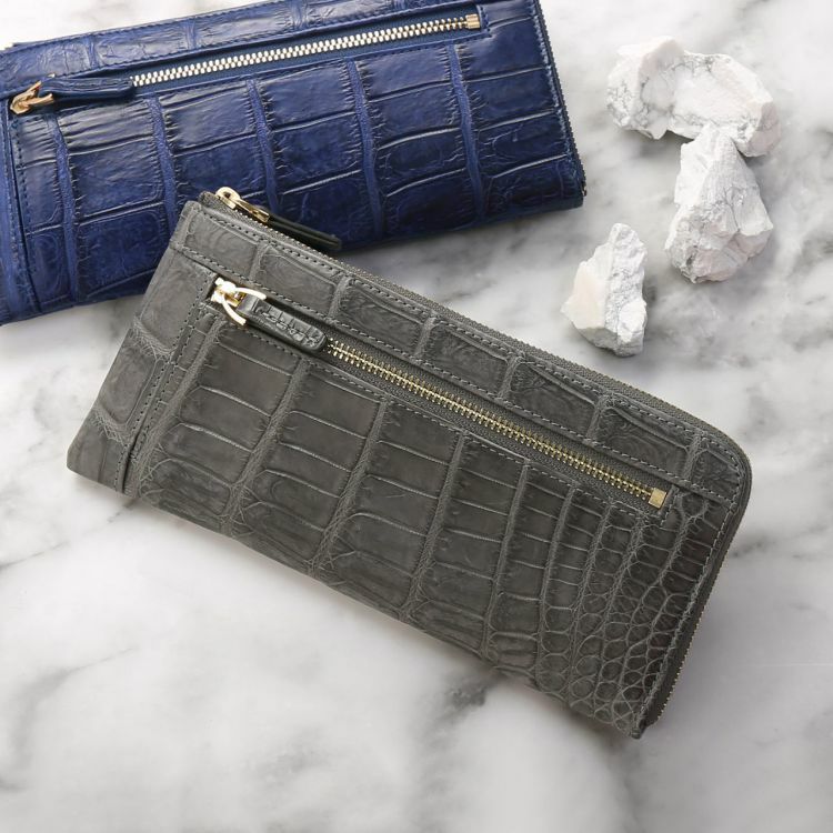 『皮革の宝石』と称される ナイルクロコダイルの革を使用しています。 数あるワニ革の中でも 高い人気を誇るエキゾチックレザーです。 表面には上品な雰囲気の マット加工を施しており、 使い込むほどに味わい深くなる 経年変化も楽しめます。 スリムな見ためですが、 紙幣・小銭・カードが 充分に入る収納力です。 外側のL字ファスナーを開けるだけで 財布の中身がすべて見えるので とても使いやすく、 お会計もスムーズに行えます。 内側の一番の特徴は、 ファスナーのない小銭入れ。 ファスナーをなくすことで お財布自体がスリムになり、 お会計にかかる時間も短縮されます。 小銭入れはしっかりと高さがあるので、 L字ファスナーを閉めれば 中身が飛び出す心配もありません。 クロコダイルの高級感を引き立てる、 ゴールドカラーのファスナーを使用しています。 ファスナーチャームにもクロコダイルを使用し、 細部までこだわったデザインになっています。