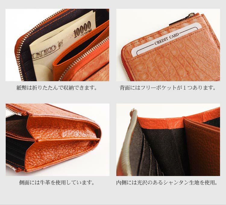 | 素材 | 表側:クロコダイル(本革) (側面には牛革を使用しています。) 内装:生地、一部牛革 |