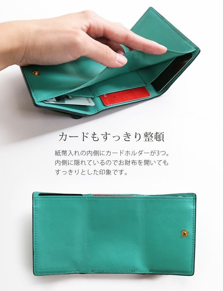 手のひらに収まるコンパクトなサイズ感が魅力の小さな三つ折り財布。