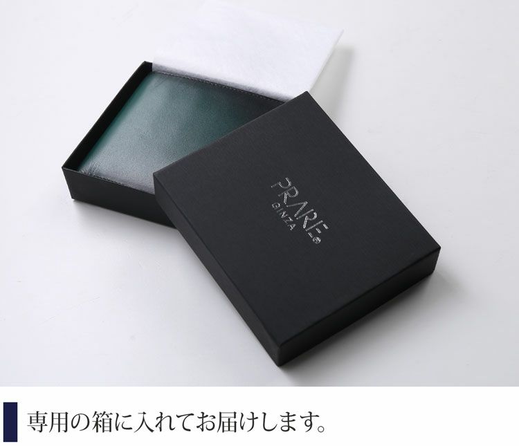 表革には日本職人の手作業によるシャドー加工を施した革を用いています。 型抜きした革1枚1枚に職人の手作業でエアーブラシによって吹き付けを施しています。 端から中央へ滑らかな濃淡を出していく作業は、職人の経験と技術のなせる業です。 硬く見えるデザインですが、使用している牛革はソフトで滑らかな手触りの牛革を使用。 思わず触れたくなる手触りと美しいグラデーションが魅力の財布です。 手に馴染む柔らかな触り心地。 美しいグラデーションが手元をオシャレに飾ります。 内装にMADE IN JAPANの文字が刻印されています。 日本製品の魅力として第一に挙げられるのが「作りの良さ」です。 日本特有の細やかで正確な作業は、 海外の職人には真似る事のできない日本が誇る伝統的な技術の一つです。 また、この緻密で正確な隙の少ない作りにより製品の耐久性が高く、 長く使えるというメリットがあり、世界中から日本製品はリスペクトされています。 内側の革は全色共通で落ち着いた印象のブラックカラーで統一。 シンプルでオーソドックスな造りで、 財布をスマートに持ちたい方におすすめです。 内側の左側はカードホルダー×4が付いており、 右側はスナップボタン付きの小銭入れになっています。 紙幣入れは二層に分かれています。 カードホルダーや小銭入れの奥に 合計3つのポケットがあります。 専用の箱に入れてお届けします。 プレゼントにもおすすめのアイテムです。