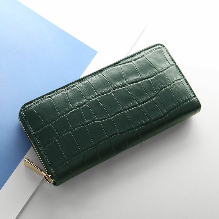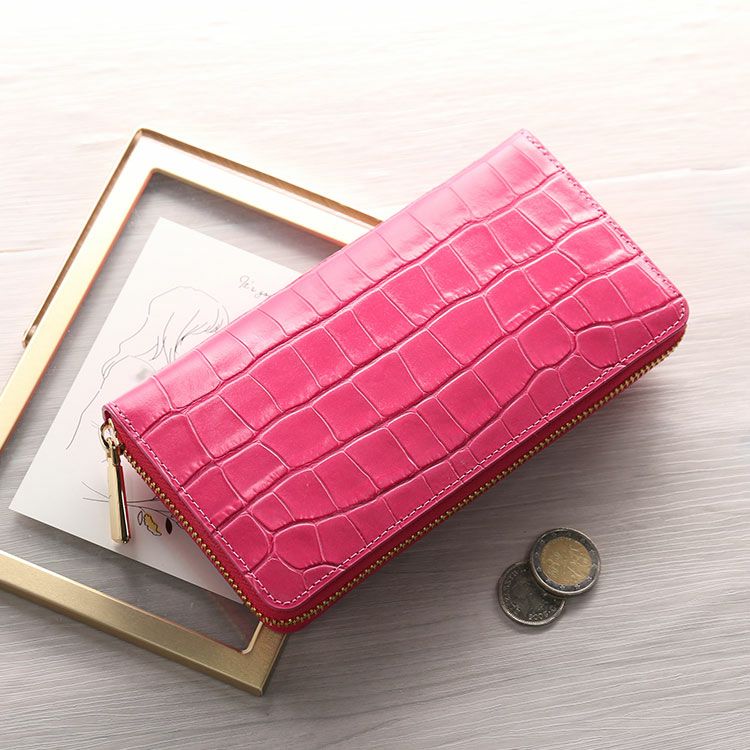 クロコダイル型押しの牛革を使用したラウンドファスナー長財布。