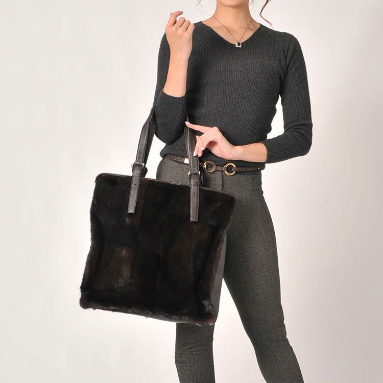 ミンク & ラムレザー コンビネーション ファーバッグ トートバッグ レディース 秋 冬 底鋲 ダークブラウン/ブラック ファー バッグ 母 女性 プレゼント ギフト ladiesbag