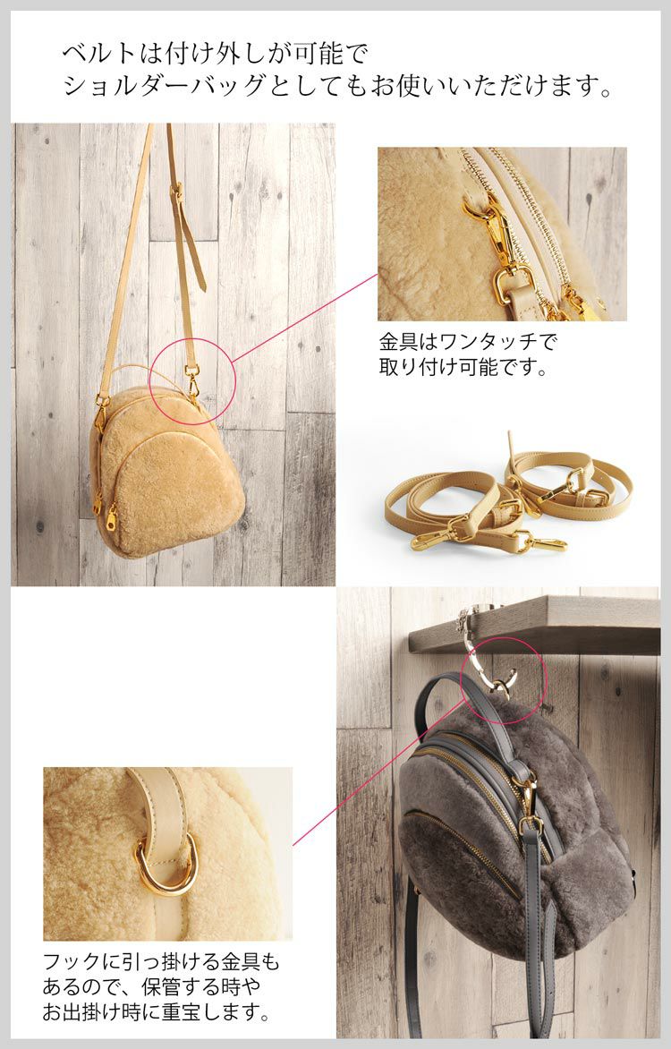 | 素材 | 毛皮:ムートン(羊革) 内装:ポリエステル100% ショルダー:牛革 |