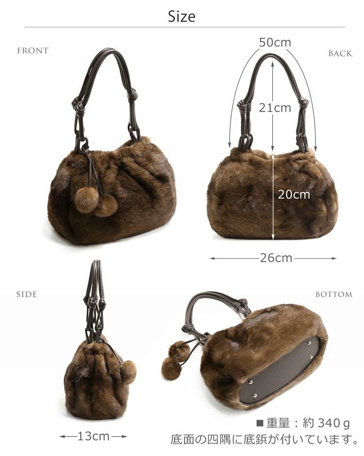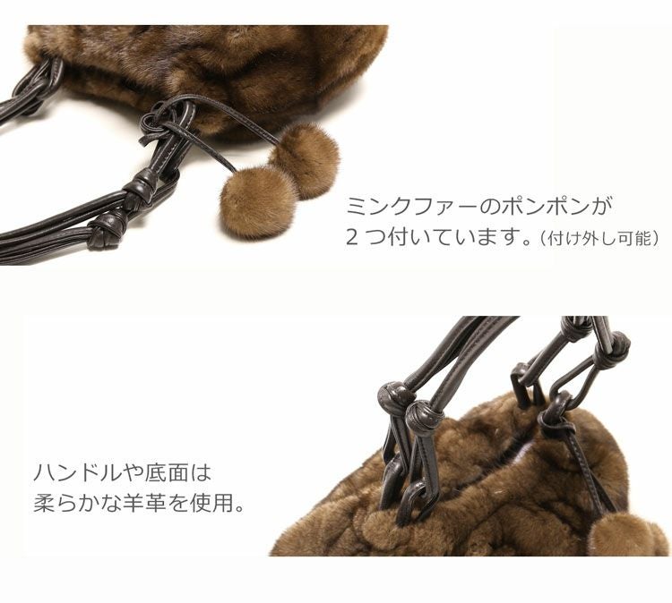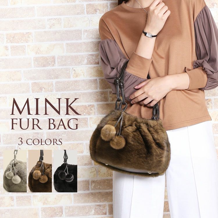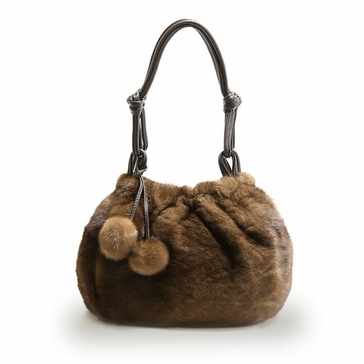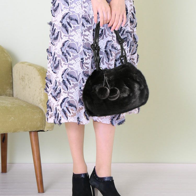 | 商品名:ミンク ファーバッグ ポンポン デザイン 羊革 ハンドル シルバーブルー/スカンブラウン/ブラック 秋冬 軽量 |