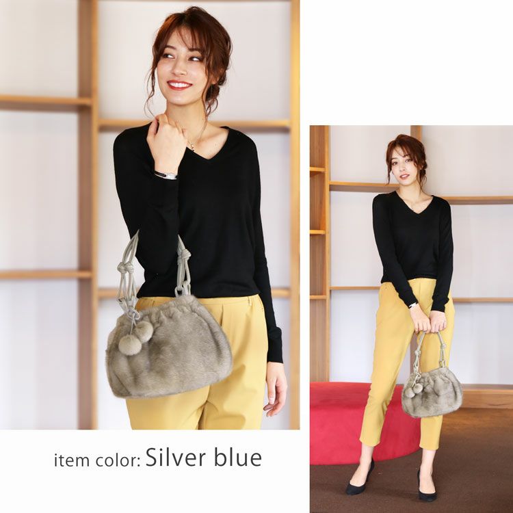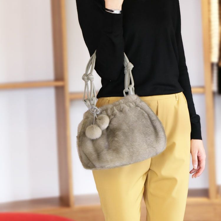 ミンク ファーバッグ ポンポン デザイン 羊革 ハンドル シルバーブルー/スカンブラウン/ブラック 7F