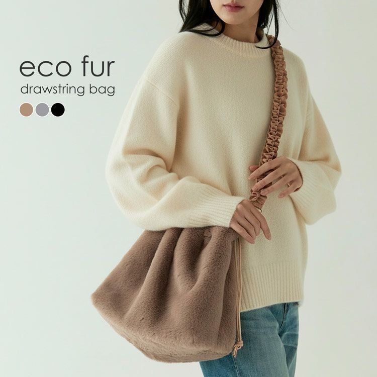 ファーバッグ レディース エコファー 巾着バッグ ショルダーバッグ フリル フェイクファー A4 ショルダー 斜めがけ バッグ ふわふわ 大きめ キャメルベージュ ライトグレー ブラック ギフト プレゼント