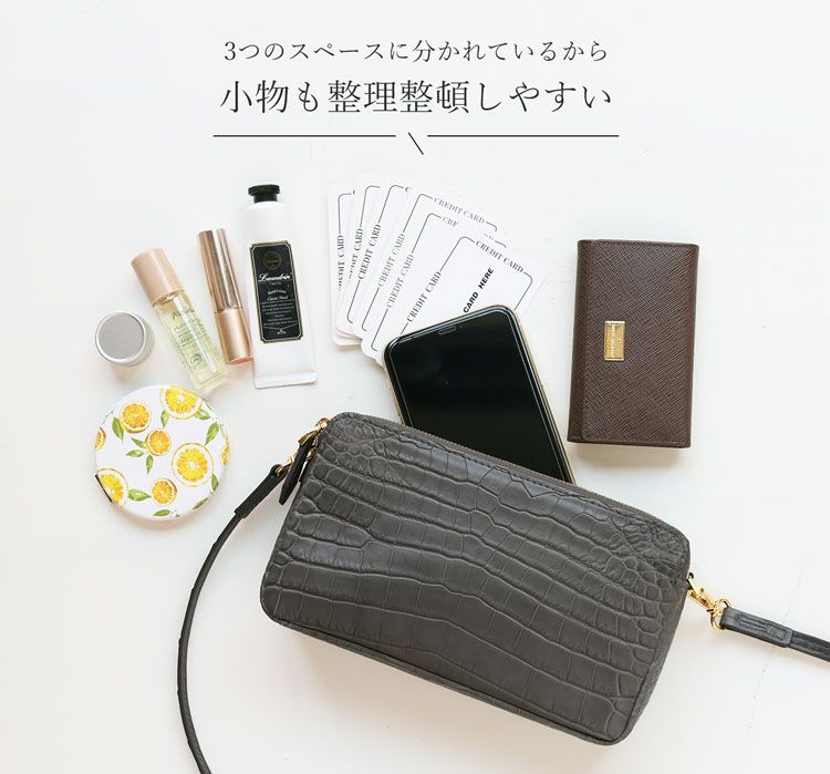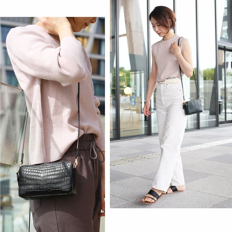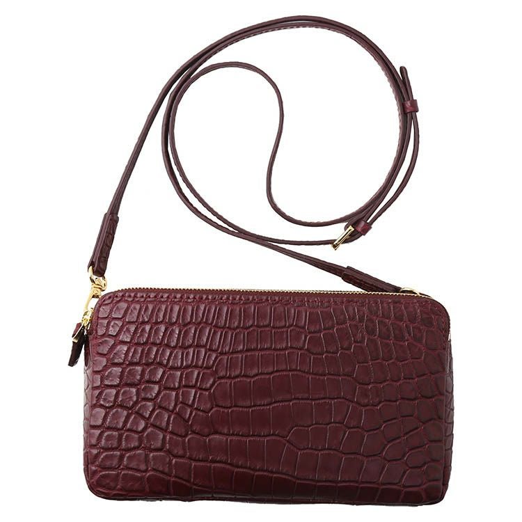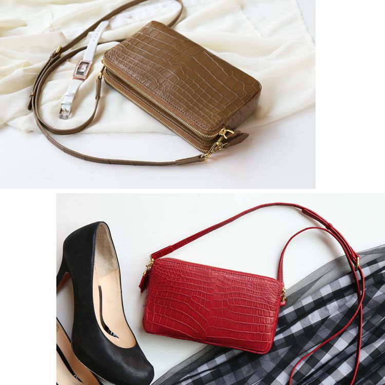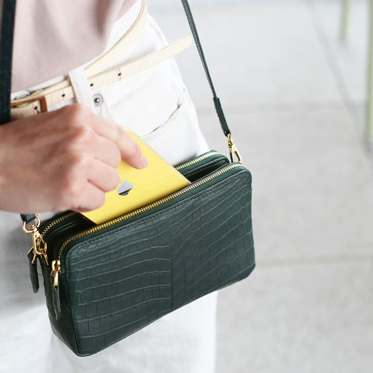 シンプルなスクエア型がかわいい、クロコダイルのミニショルダーバッグ。
