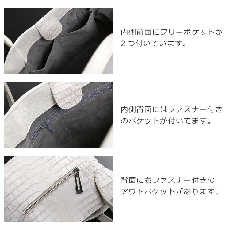 クロコダイルの腹部の革をバッグの中央に配しています。