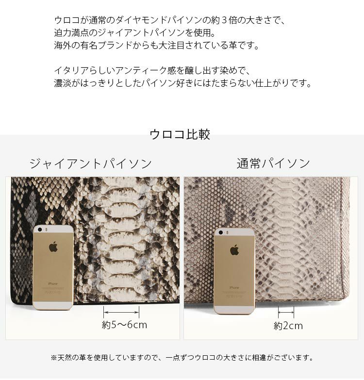 | 素材 | 表側:パイソン、牛革(本革) 内装:生地、一部牛革 |