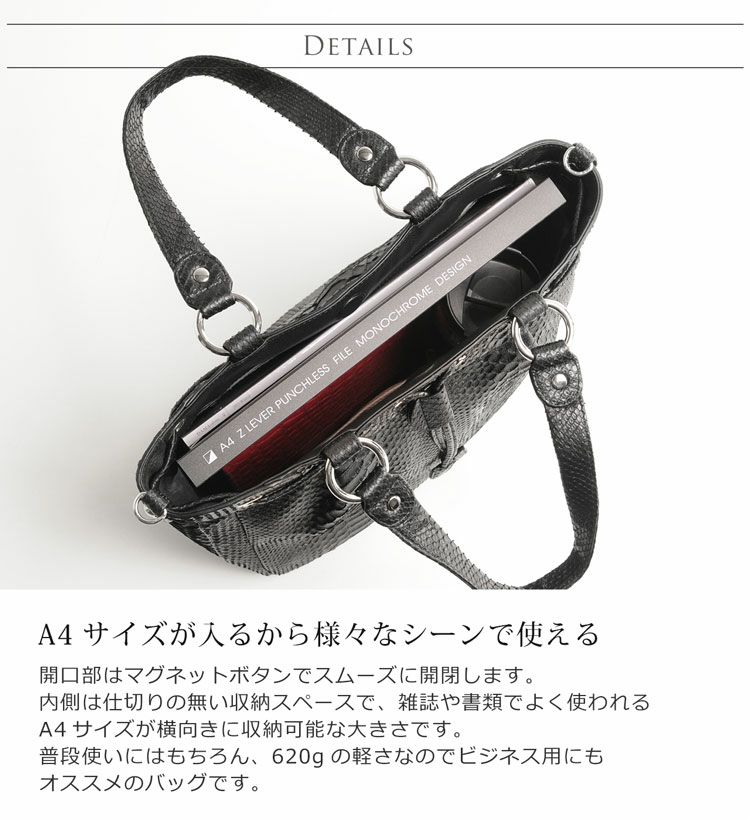 | 商品名:パイソン トートバッグ レディース 大きめ A4 対応 2WAY 斜めがけ イタリア製 蛇革 使用 本革 革紐 フリンジ デザイン ナチュラル/グレー/ブラウン/ブラック |