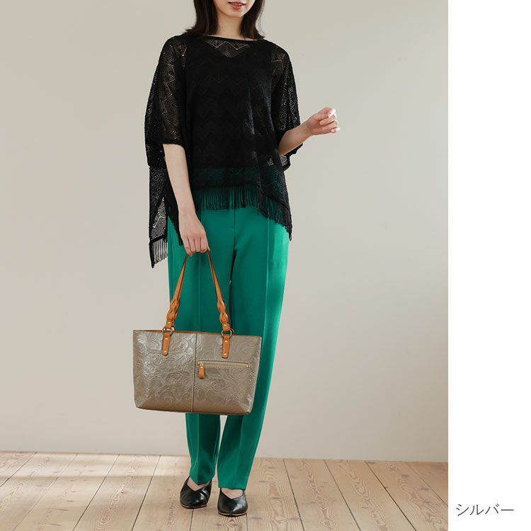 ローズの花柄を牛革に型押しした革で仕立てた本革トートバッグ。