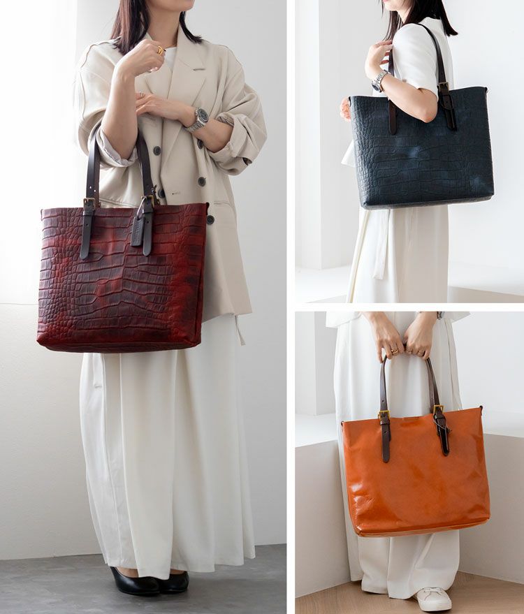 ※キーワード:レディーストートバッグ トート型 本革 レザー 牛革 ヌメ革 クロコ型押し 大きめ 日本製 鞄 プレゼント 名入れ 記念品 ビジネスバッグ 旅行 通勤バッグ