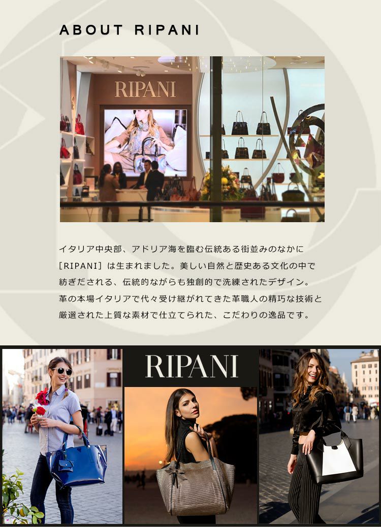 | ブランド紹介 | イタリア中央部、アドリア海を望む伝統ある街並みのなか生まれたRIPANI。美しい自然と歴史ある街並みの中で紡ぎだされる、伝統的ながらも独創的で洗練されたデザイン。熟練の革職人が精巧な技術で仕立てたこだわりの逸品が揃っています。 |
