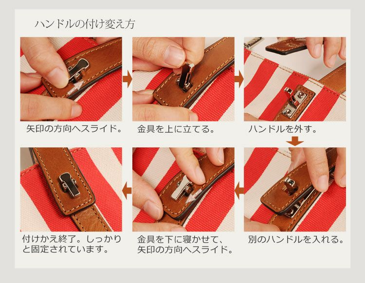 ハンドルが二つ付いていて、金具で簡単に付けかえられます。