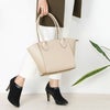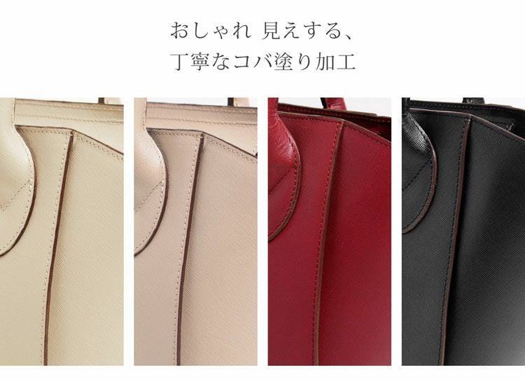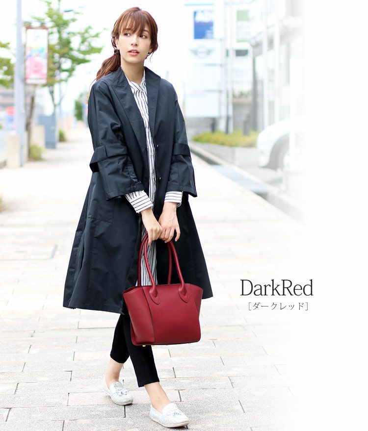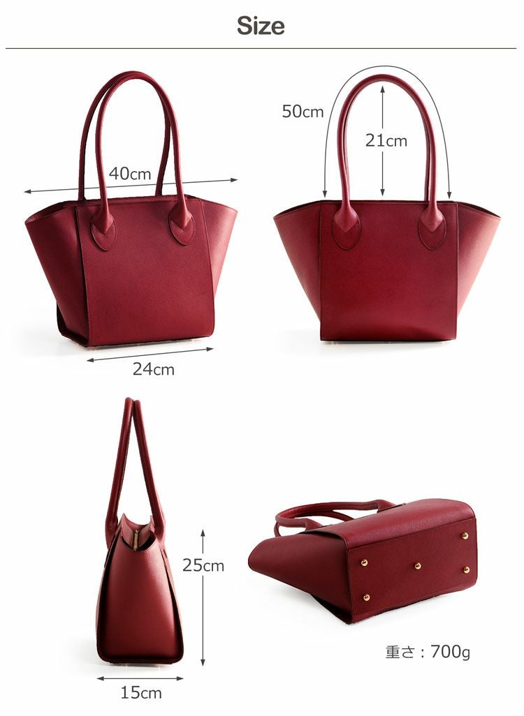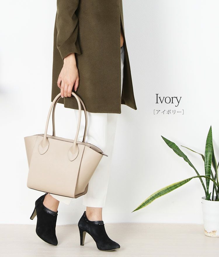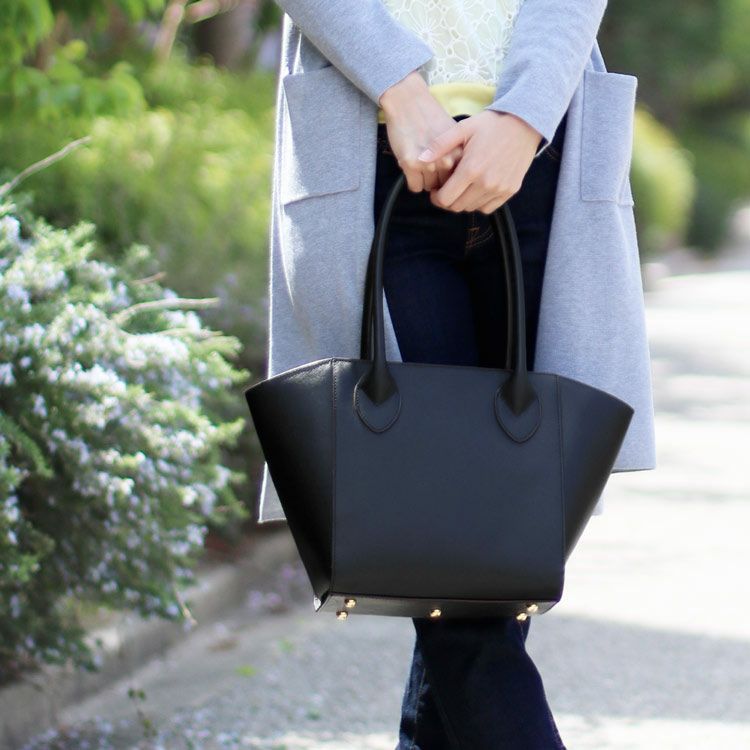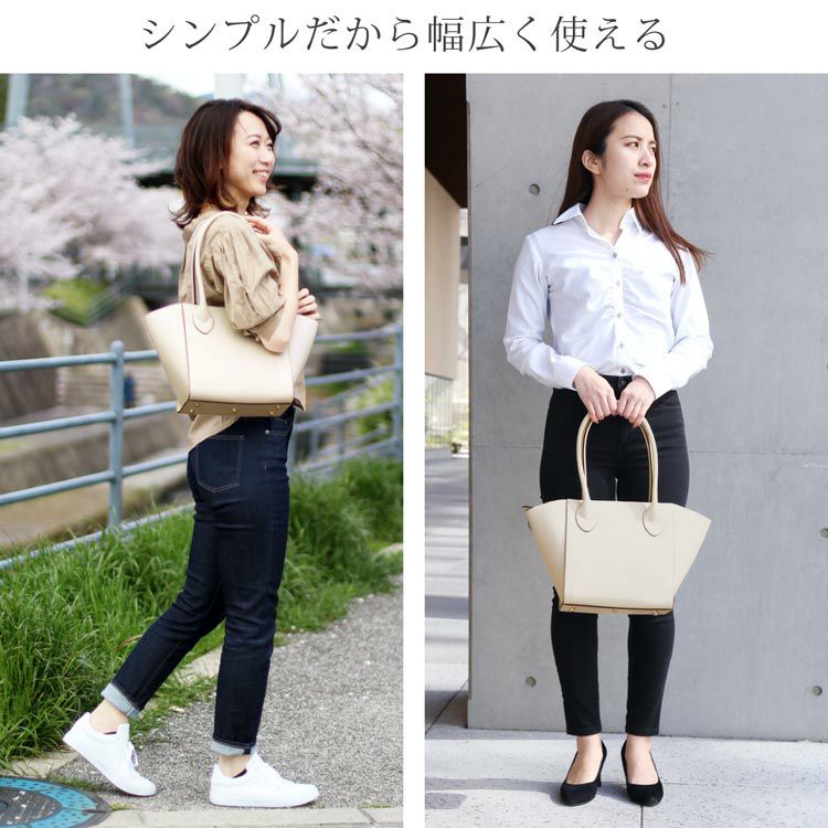 シンプルで使いやすい、大人の女性のためのきれいめトートバッグです。プライベートだけでなく、お仕事バッグとしても最適なサイズ感で汎用性抜群です。底鋲もついているので、床に置く時も汚れの心配がありません。